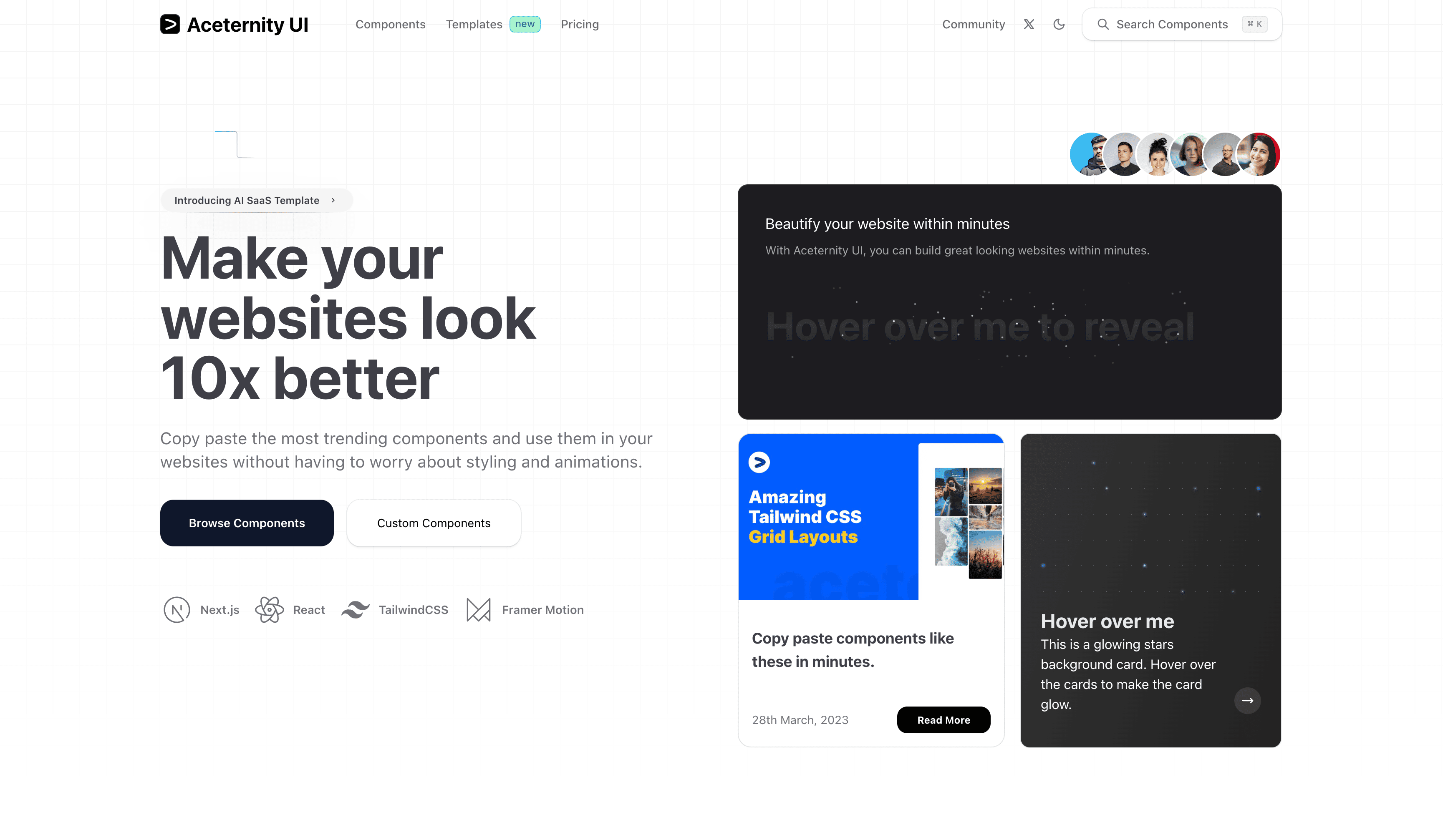 该平台支持 Next.js、React、TailwindCSS 和 Framer Motion 等技术栈,并允许用户通过浏览和选择组件来个性化网站。平台展示了一些示例组件,如一个带有星空背景的卡片,用户可以通过悬停来触发卡片的发光效果。