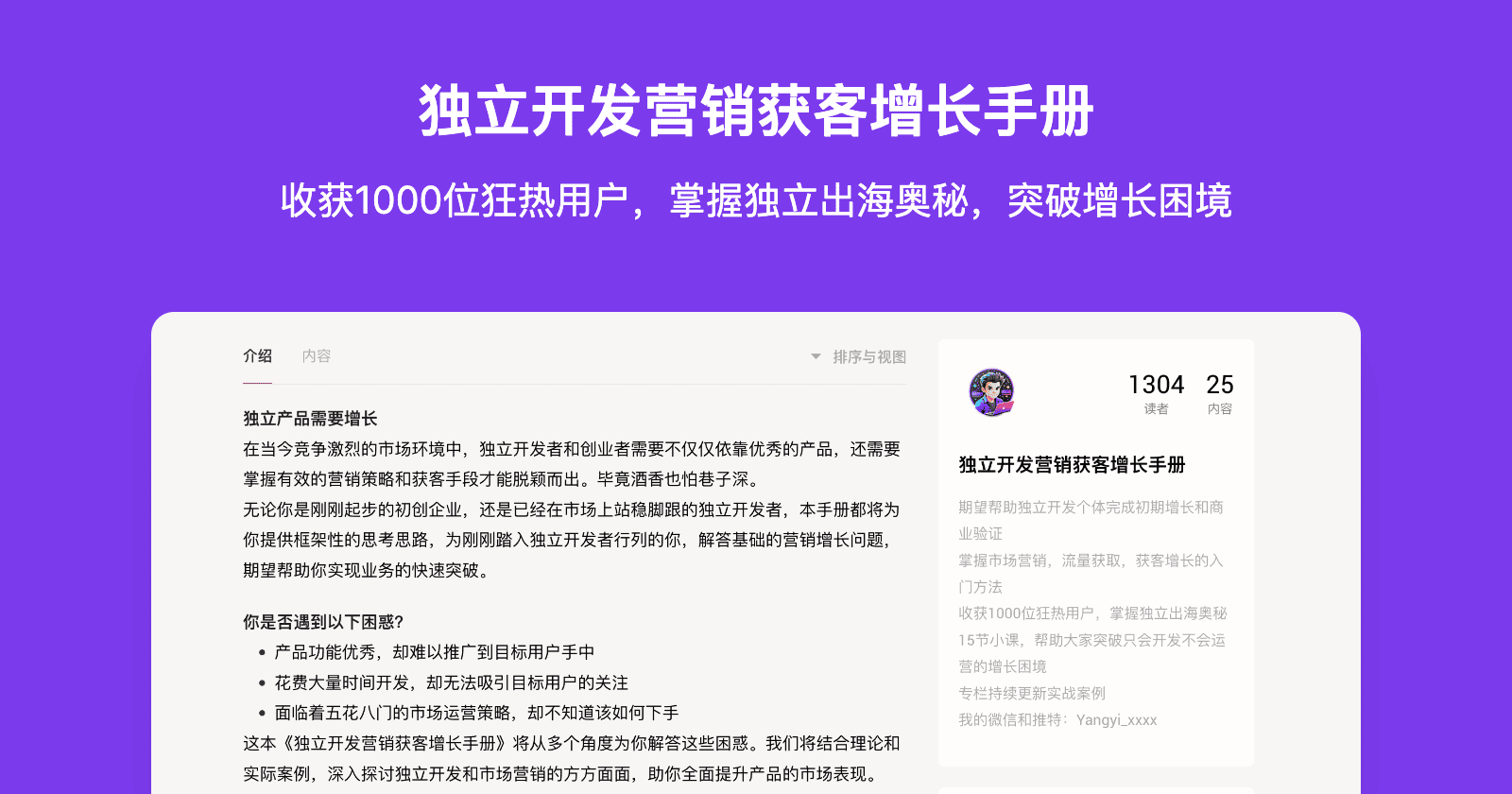 期望帮助独立开发个体完成初期增长和商业验证掌握市场营销,流量获取,获客增长的入门方法收获1000位狂热用户,掌握独立出海奥秘15节小课,帮助大家突破只会开发不会运营的增长困境专栏持续更新实战案例