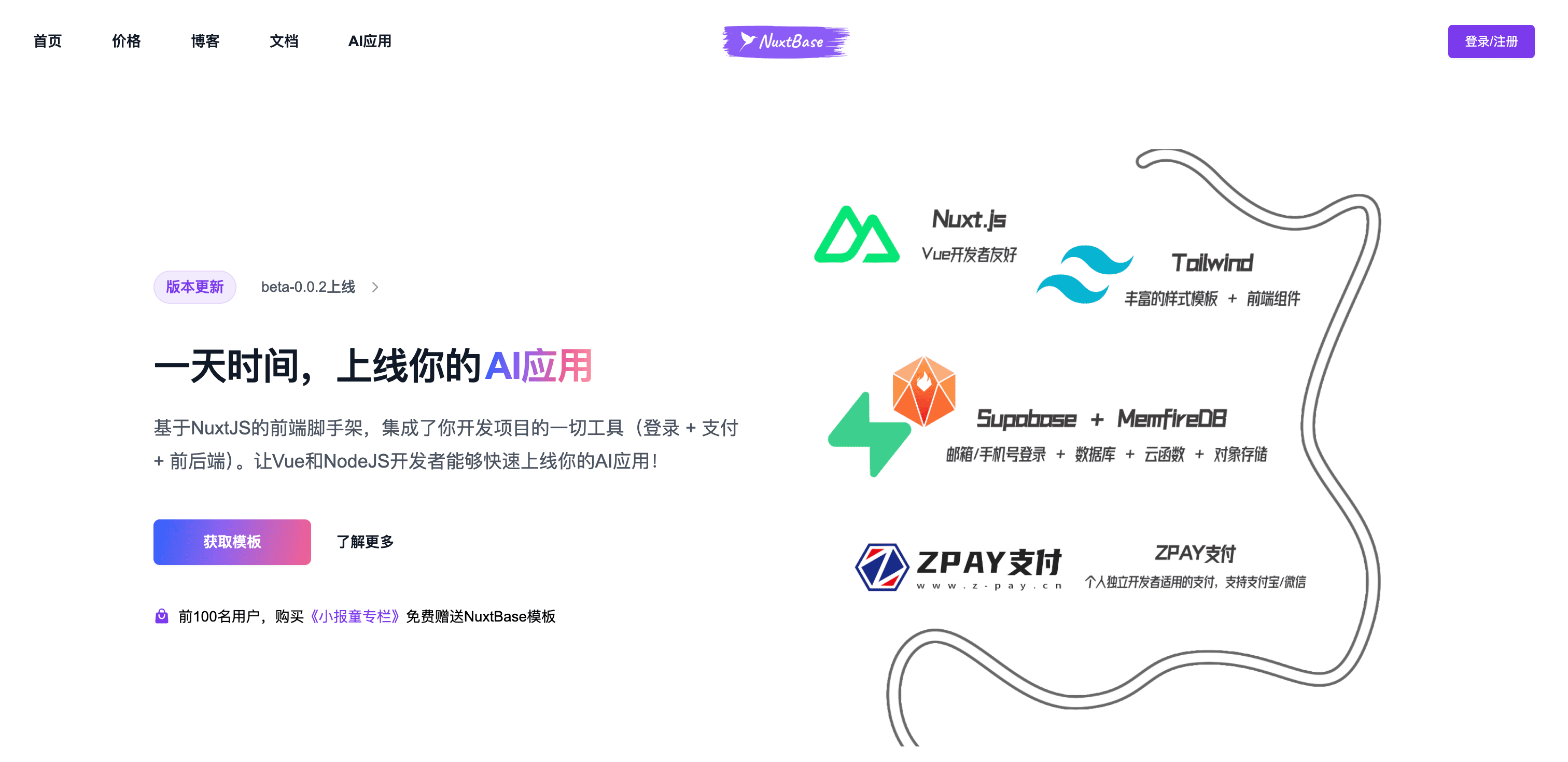 NuxtBase 是一个基于 Nuxt.js 的 AI 开发脚手架。旨在帮助独立开发者们👨💻👩💻,快速开发、构建、部署面向国内用户和大模型服务商的 AI 应用。