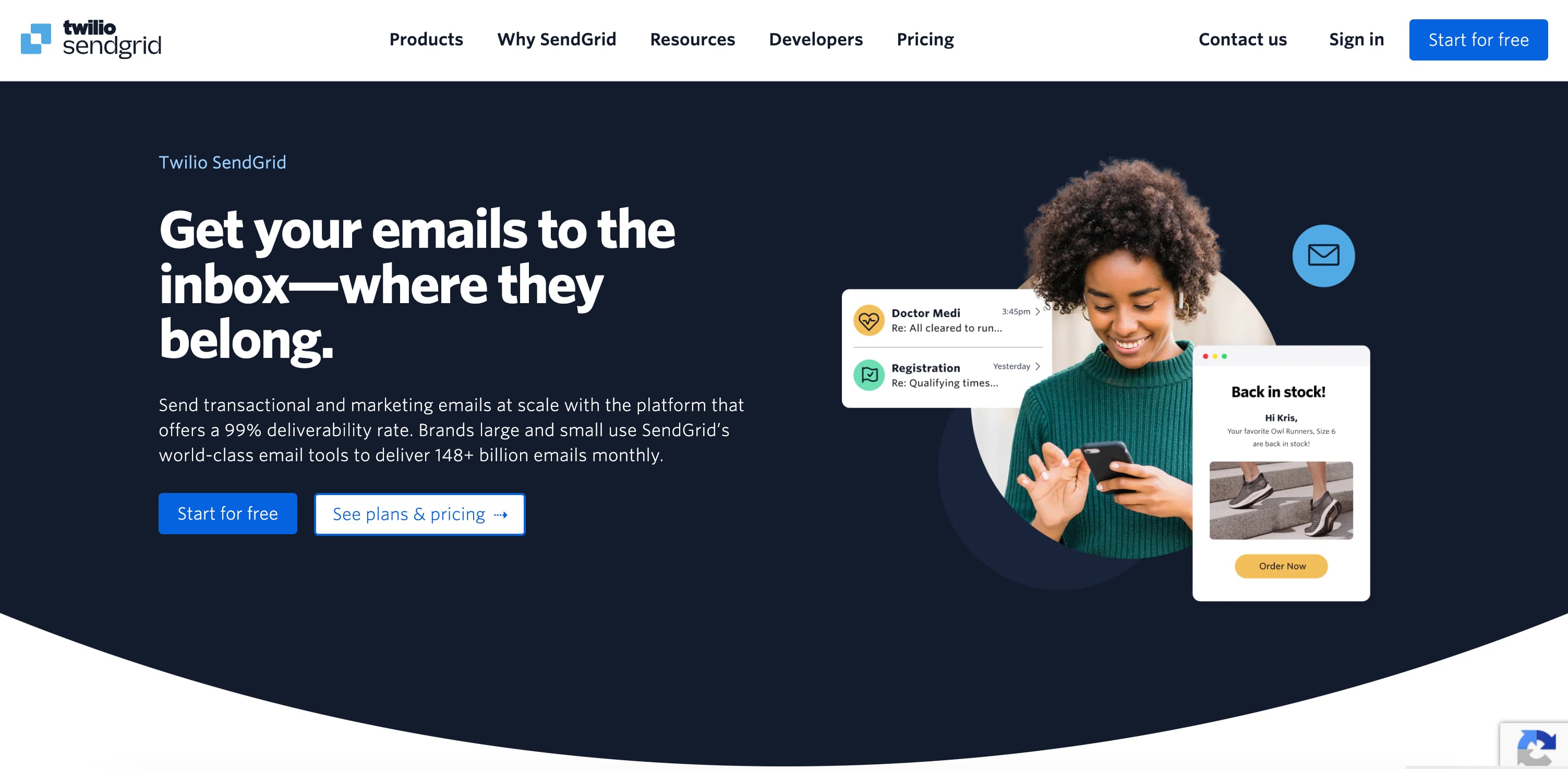 Get your emails to the inbox—where they belong. Send transactional and marketing emails at scale with the platform that offers a 99% deliverability rate. Brands large and small use SendGrid’s world-class email tools to deliver 148+ billion emails monthly.