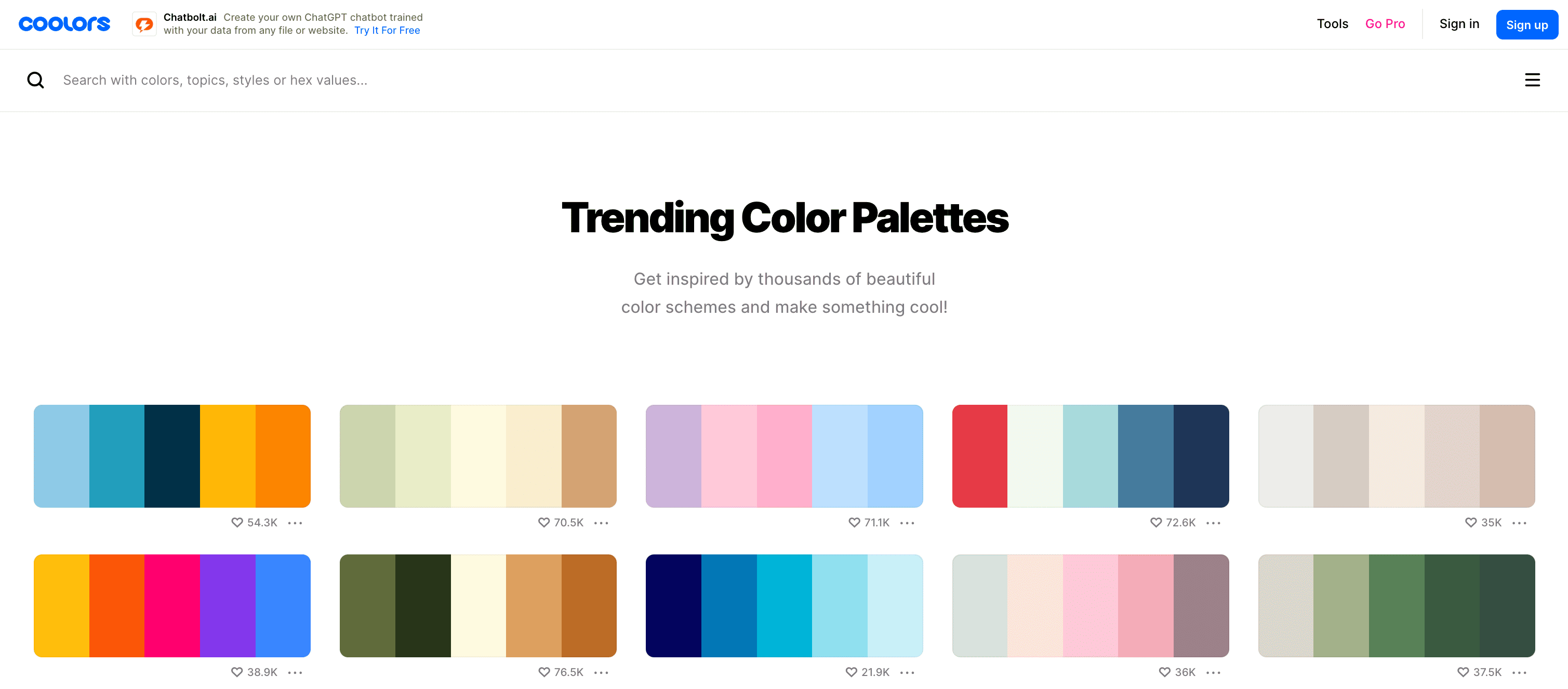 Coolors offers a comprehensive suite of color tools for designers and creatives, including a palette generator, color contrast checker, and various export options, with both free and Pro subscription-based features.