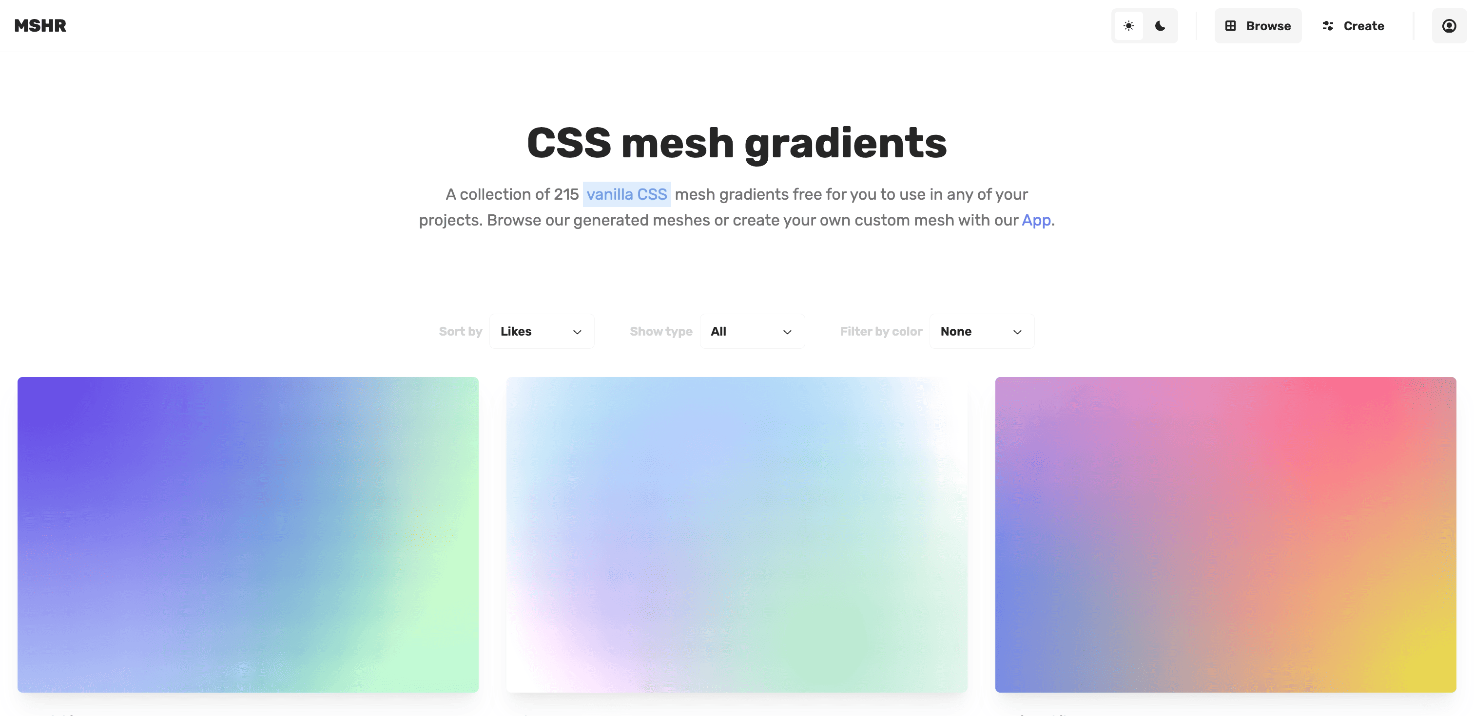 A collection of 215 vanilla CSS mesh gradients free for you to use in any of your projects. Browse our generated meshes or create your own custom mesh with our App.