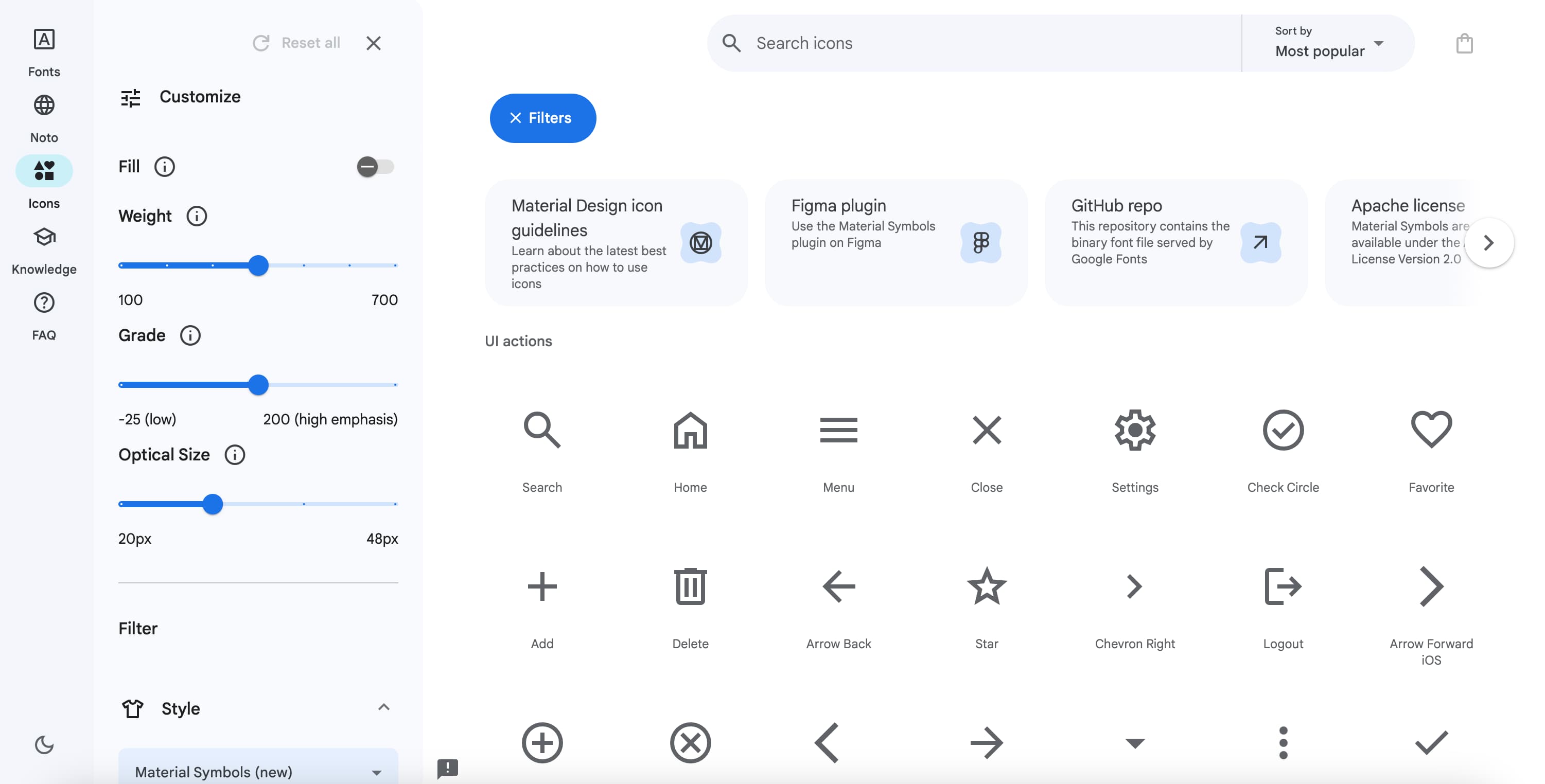 The icons can be browsed in a more user-friendly way at https://fonts.google.com/icons. Use the popdown menu near top left to choose between the two sets; Material Symbols is the default.