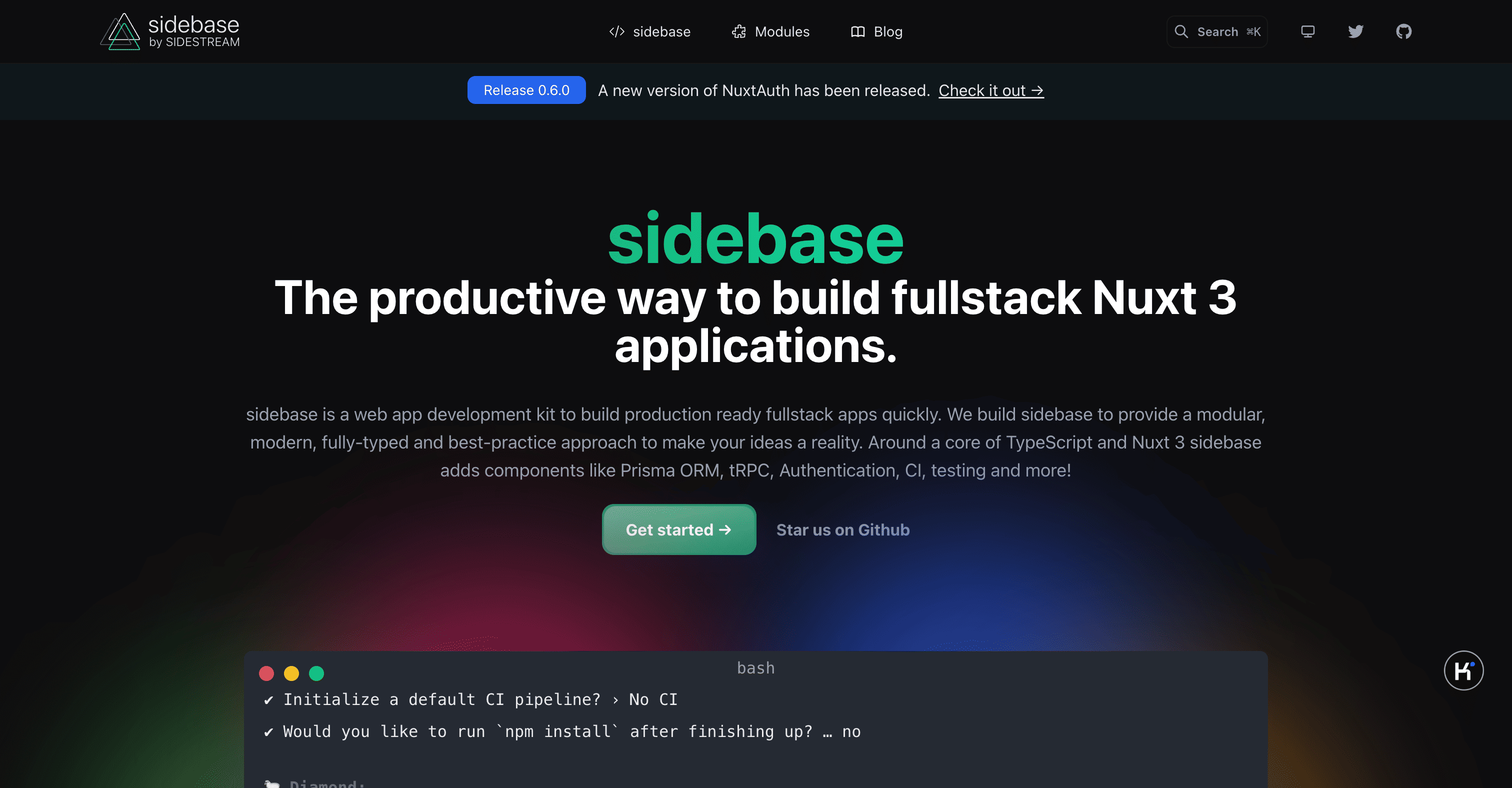 sidebase is a web app development kit to build production ready fullstack apps quickly. We build sidebase to provide a modular, modern, fully-typed and best-practice approach to make your ideas a reality. Around a core of TypeScript and Nuxt 3 sidebase adds components like Prisma ORM, tRPC, Authentication, CI, testing and more!